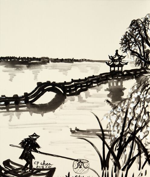 曲桥前孤单的老鸟